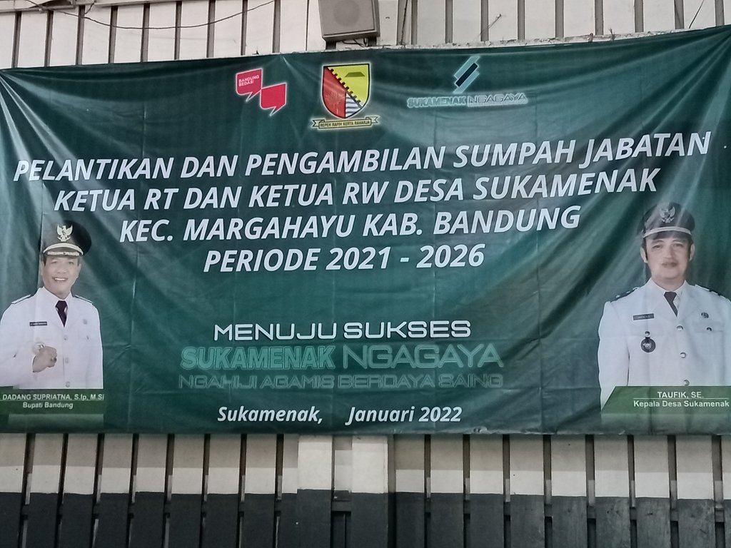 Pada hari ini di Desa Sukamenak berlangsung acara pelantikan para Ketua RW dan Ketua RT Periode 2021 – 2026 menuju Sukses Sukamenak Ngagaya (Ngahiji, Agamais, Berdaya Saing).Kegiatan dilaksanakan hari ini pada hari Jum’at tanggal 7 Januari 2022, bertempat di Gedung Aula ANimah.