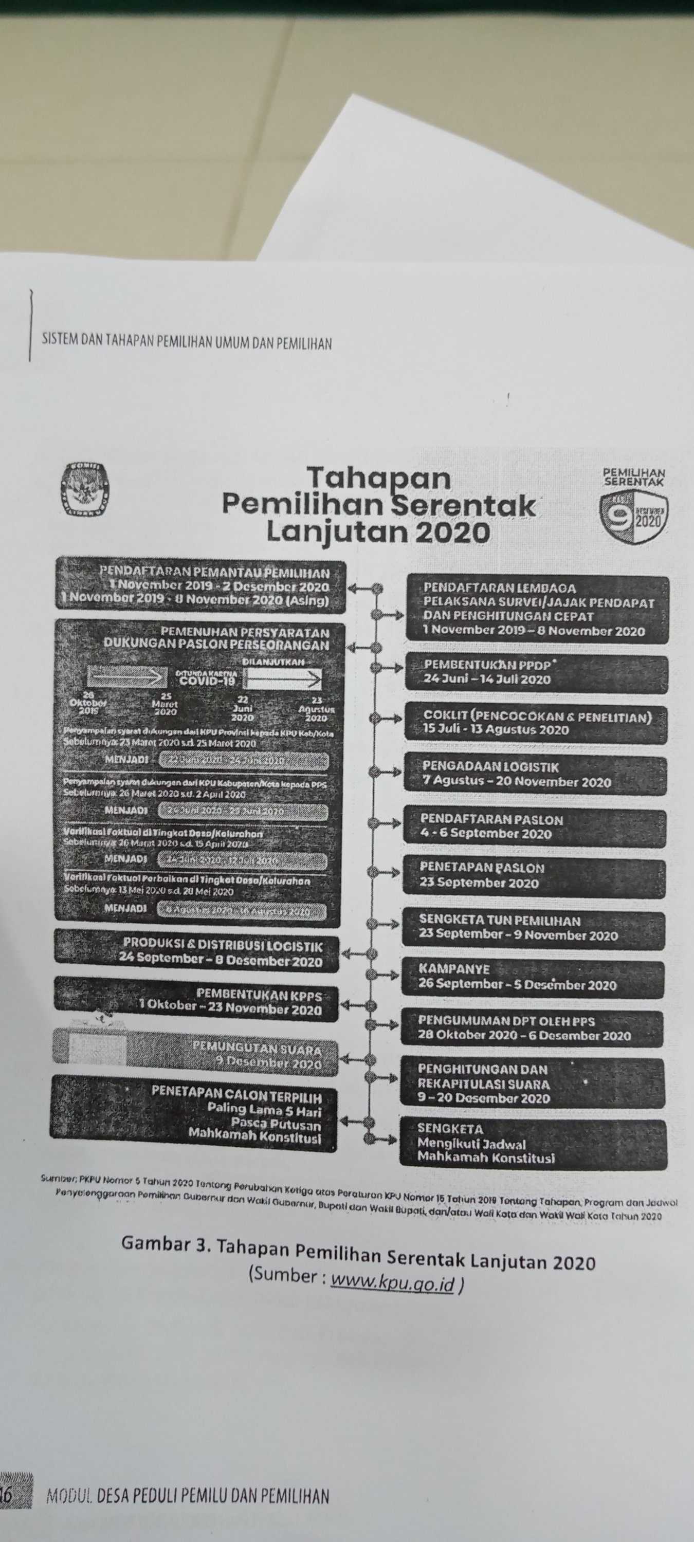 1. Perencanaan Program dan Anggaran, 2. Penyusunan Peraturan KPU, 3. Sosialisai 4. Pemutakhiran Data Pemilih Dan Penyusunan Daftar Pemilih, 5. Pebdaftaran dan Verifikasi Peserta Pemilu. 6. Penetapan Peserta Pemilu, 7. Pembentukan Badan Penyekenggara, 8. Penataan Dan Penetapan Daerah, 9. Pencalonan Presiden dan Wakil Presideb serta Anggota DPR, DPD, DPRD Provinsi, dan DPRD Kabupaten/ Kota, 10. Logistik, 11. Masa Kompanye Pemilu, 12. Laporan Dan Audit Dana Kompanye. 13. Masa Tenang, 14. Pemungutan dan Penghitungan Suara, 15. Rekapitulasi Hasil Penghitungan Suara, 16. Penyelesaian Perselisihan Hadil Pemilu, 17. Penetapan Hasil Pemilu, 18. Pengucapan Sumpah/Janji Presiden Dan Wakil Oresiden Serta Anggita DOR, DPD, DPRD Provinsi dan DPRD Kabupaten/Kota