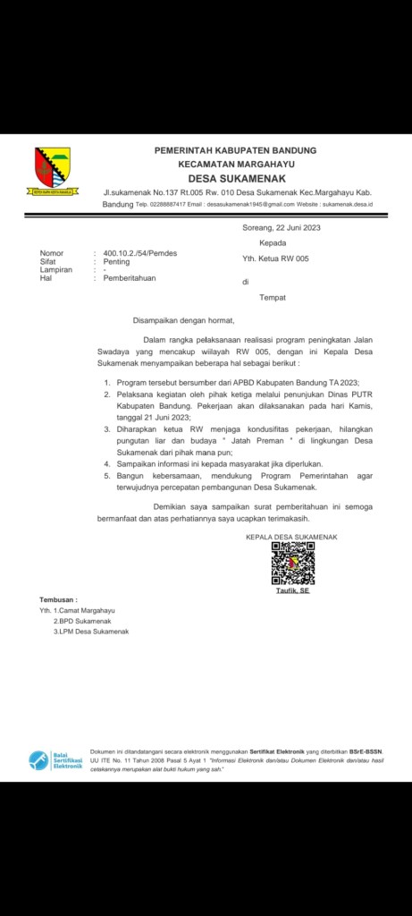 Realisasi program peningkatan Jalan Swadaya di RW. 05, Desa Sukamenak merupakan program yang bersumber dari APBD Kabupaten Bandung TA. 2023 dilaksanakan oleh Pihak ke Tiga melalui Dinas PUTR Kabupaten Bandung yang di kerjakan pada hari Kamis tanggal 21 Juni 2023 jam 00.00 dini hari, di harapkan kepada seluruh elemen masyarakat agar di informasikan kepada warga , serta dapat terwujudnya kebersamaan mendukung program Pemerintahan agar cepat tercapainya program program pemerintahan yang telah di rencanakan, baik pembangunan sosial maupun pembangunan fisik da infra struktur.