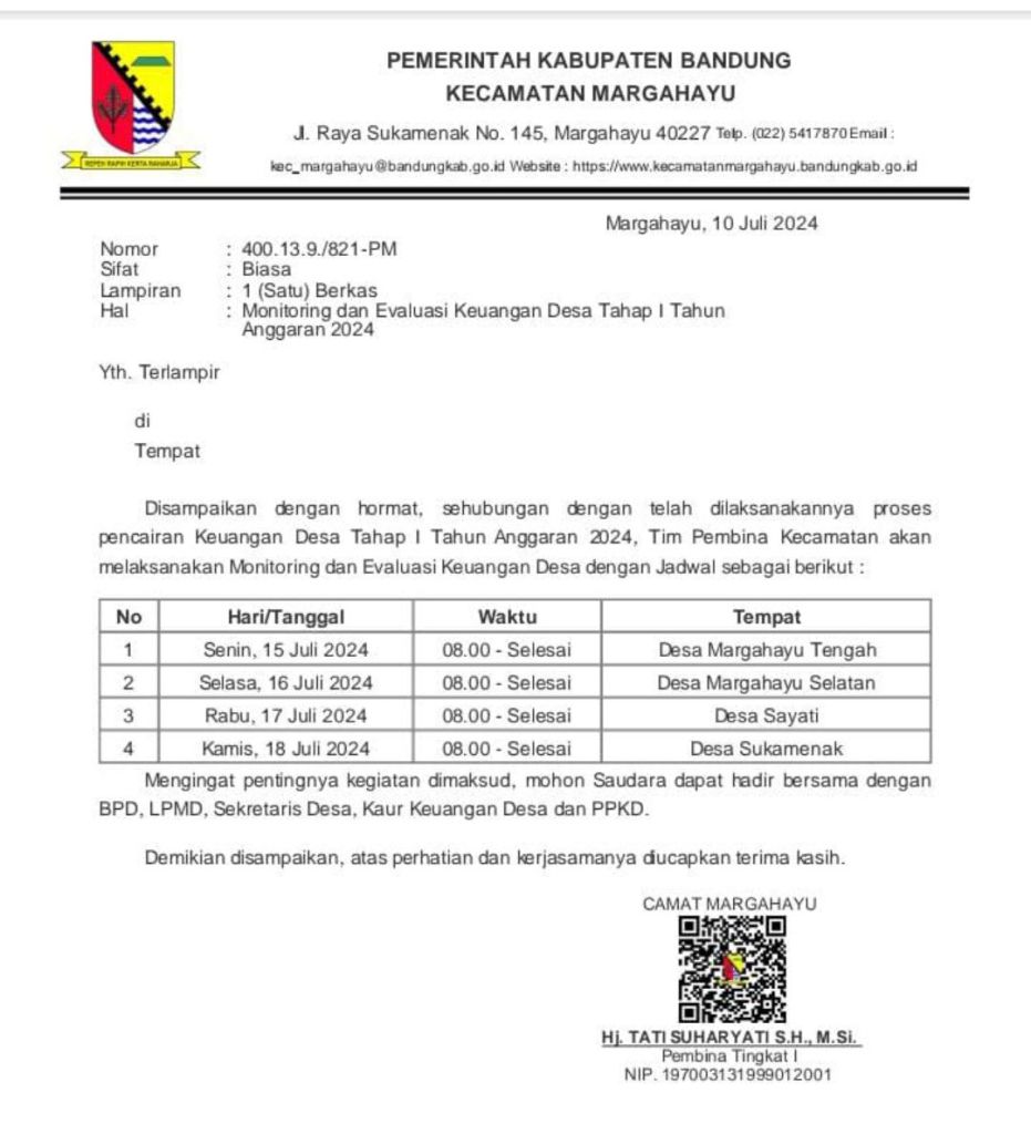 TIM Pembina Tingkat Kecamatan Margahayu akan melaksanakan Kegiatan Monitoring dan Evaluasi Keuangan Desa yang di Jadualkan di Desa Sukamenak pada Hari Kamis, 18 Juli 2024, pada Pukul 08.00 WIB SD Selesai bertempat di Desa Sukamenak, Kecamatan Margahayu.