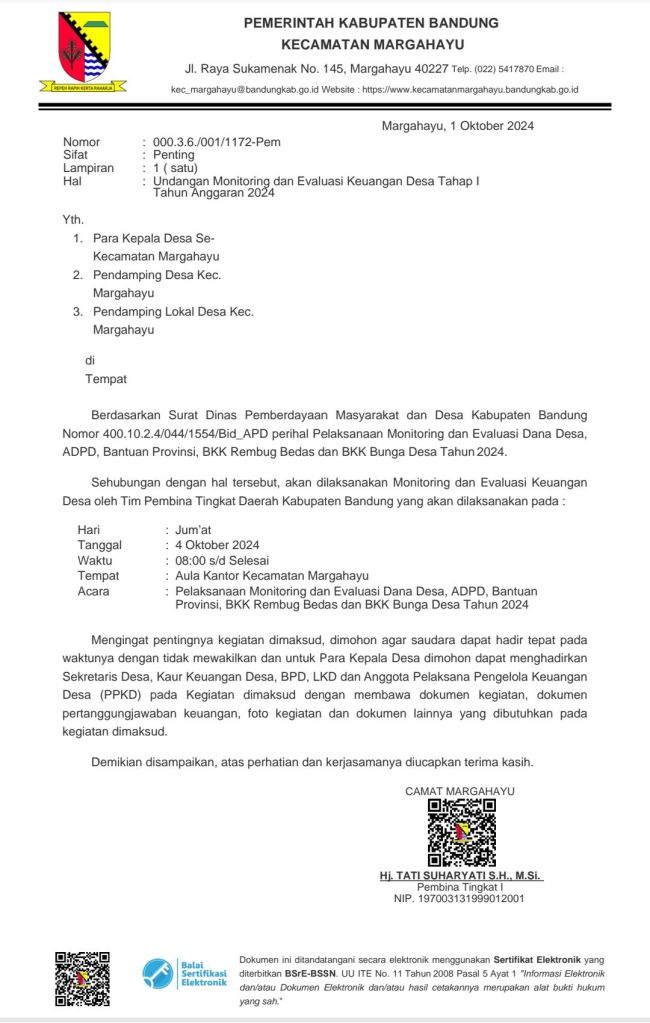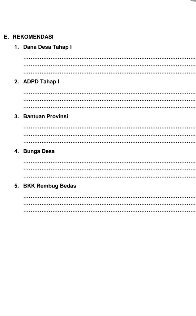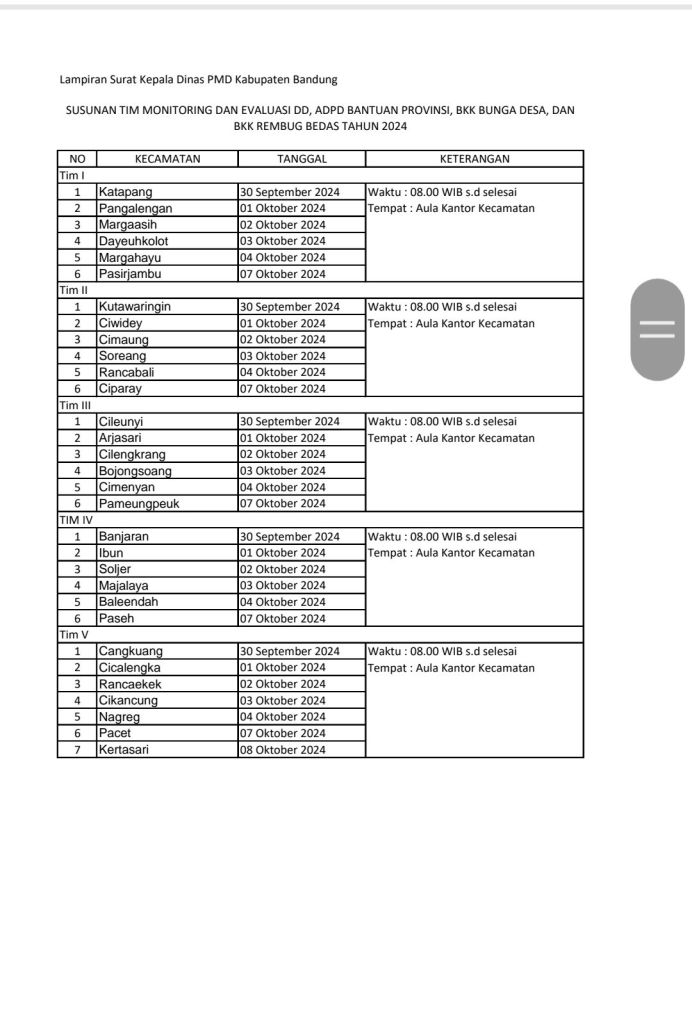 Yang harus diperhatikan yaitu pengadakan barjas SD 200 jt harus ada penawaran, dan seluruh kegiatan dokumen pajak harus di selesaikan, pelaksanaan kegiatan fisik agar sudah terselesaikan. Dan di kecamatan Margahayu di monitor kembali tentang bantuan Ketahanan Pangan, jadi di mohon perencanaan di sesuaikan dengan kegiatan itu sendiri.