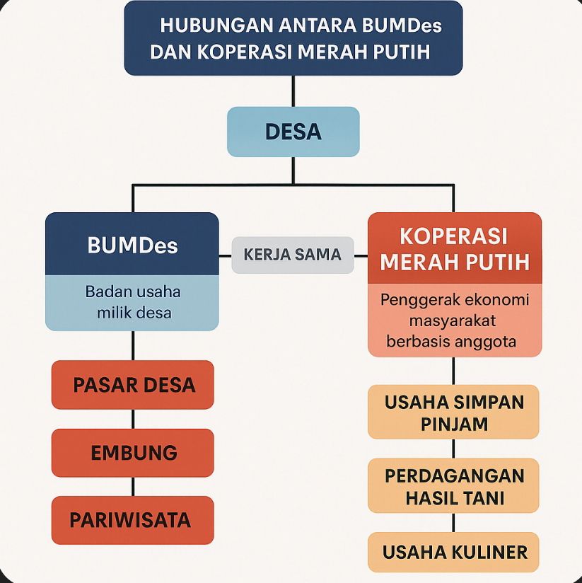 Hubungan antara Badan Usaha Milik Desa (BUMDes) dan Koperasi Merah Putih (Kopdes Merah Putih) di desa bersifat komplementer dan strategis, dengan peran yang saling melengkapi dalam membangun ekonomi desa. Berikut penjelasannya: