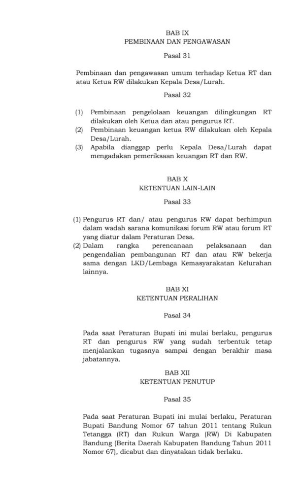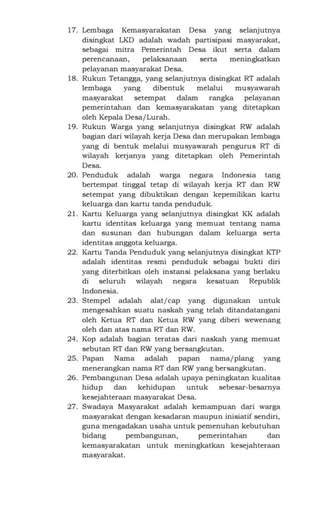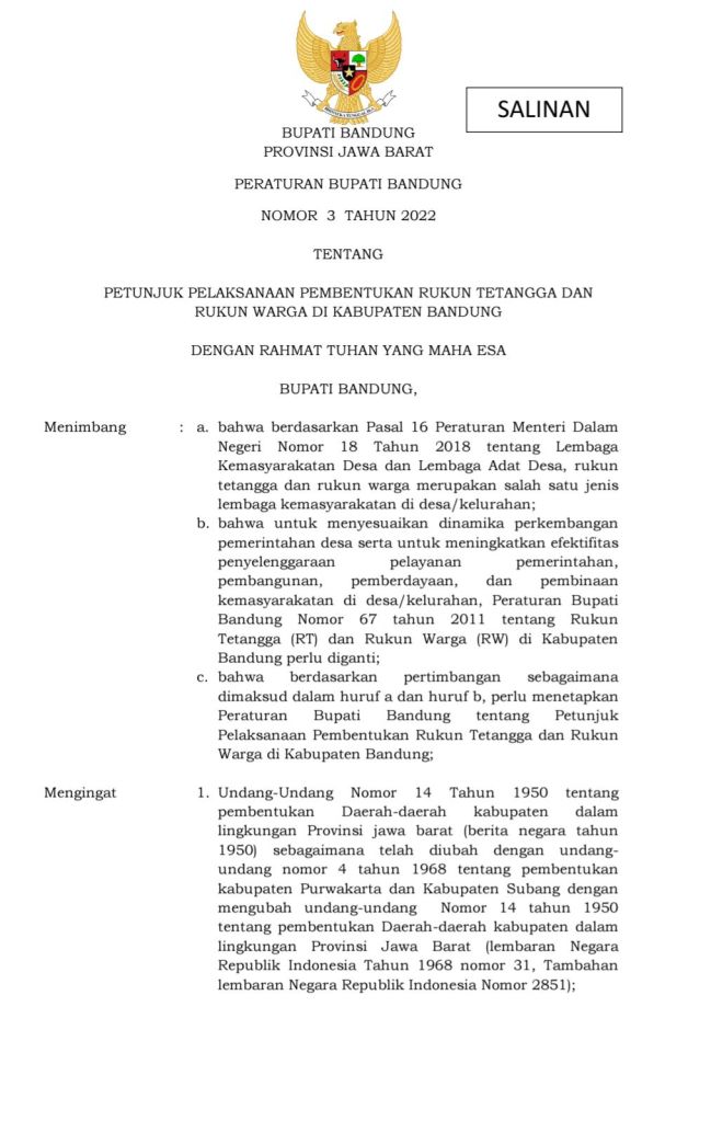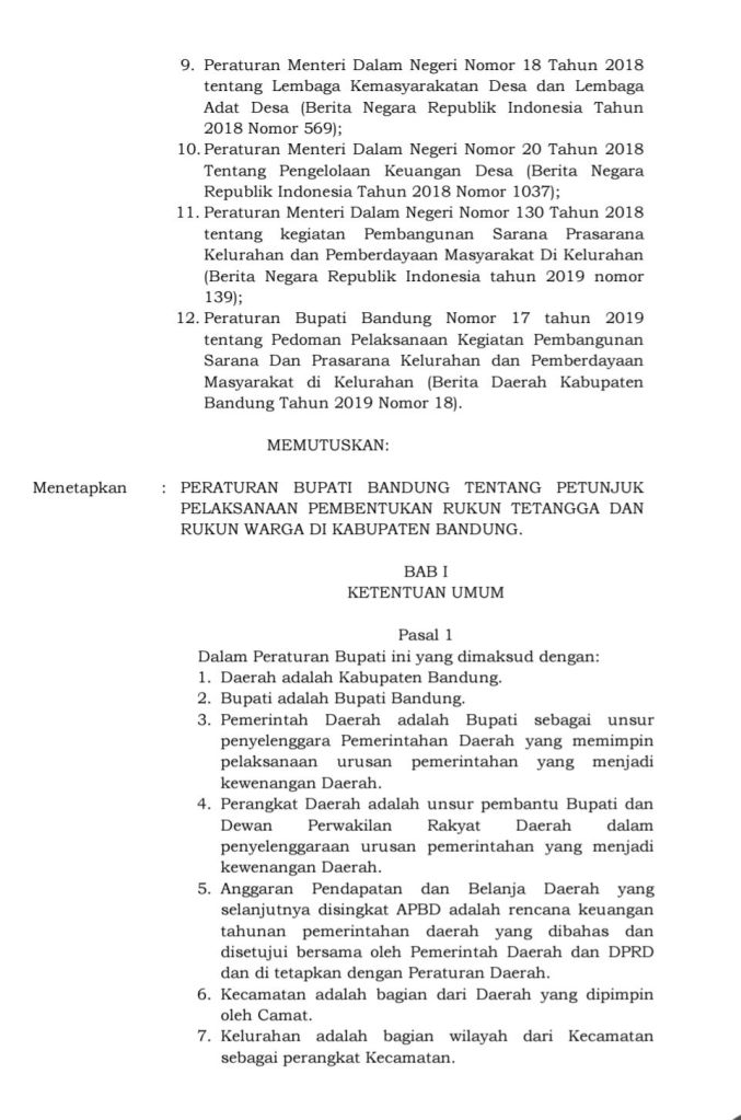 PETUNJUK PELAKSANAAN PEMBENTUKAN RUKUN TETANGGA DAN RUKUN WARGA DI KABUPATEN BANDUNG Ditulis olehH. Akang Permana, SP. MM27 September 202527 September 2025Diposkan padaKegiatan Lembaga, Lembaga Desa, Lembaga Kemasyarakatan Desa, lpmd sukamenakTag:Perbub No. 3 Tahun 2023 Peraturan Bupati Bandung Nomor 3 Tahun 2023 Bagikan ini: Bagikan ke X(Membuka di jendela yang baru) X Bagikan pada Facebook(Membuka di jendela yang baru) Facebook Suka Memuat... Terkait Diterbitkan oleh H. Akang Permana, SP. MM H. Akang Permana, lahir di Bandung, 19 Agustus 1958 Lihat lebih banyak pos